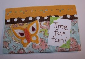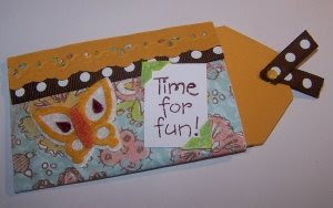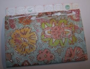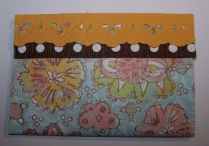 7. Now ,you can decorate the front of the gift card holder any way to choose.I chose to cover up the fold where the pp met at the top with a piece of cardstock left over from the tag and added a piece of ribbon as well. I added an embellishment and a little card with a message on it.