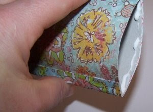 3. Cover one side of the tp roll with glue and adhere the pp to it. I left some for a flap. Fold the pp and put glue on the other side and this is where you may have to trim one side.